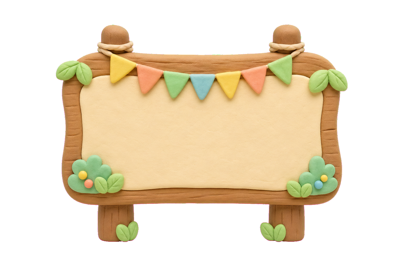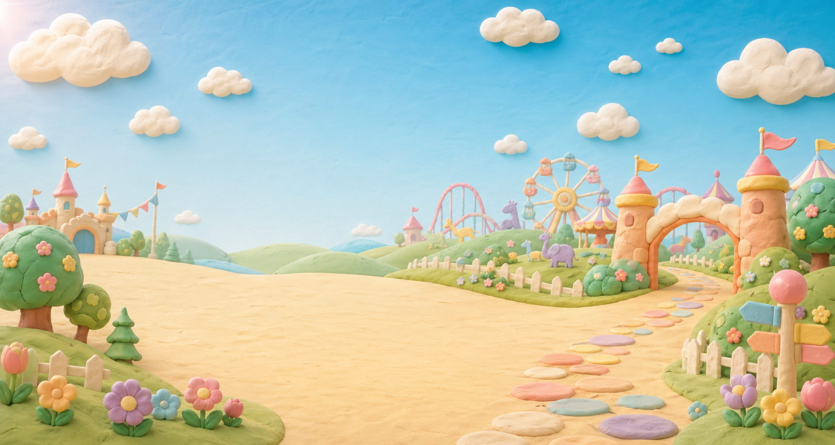 ライオンくん、ゾウさん、ウサギちゃんが まっているよ。おおきな いりぐちを えらんで、クレイテーマパークの なかへ しゅっぱつ!